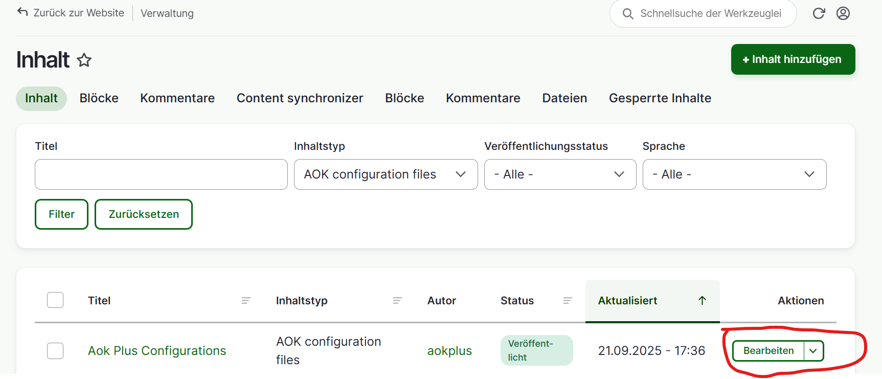 1. After a successful login, click on Inhalt (Content) -> Inhaltstyp (Content Type) -> AOK configuration files -> click on Bearbeiten (Edit). Once you reach the edit page, the lock will be enabled for 30 minutes, and no other user can edit the page until the lock is broken manually or after 30 minutes.
