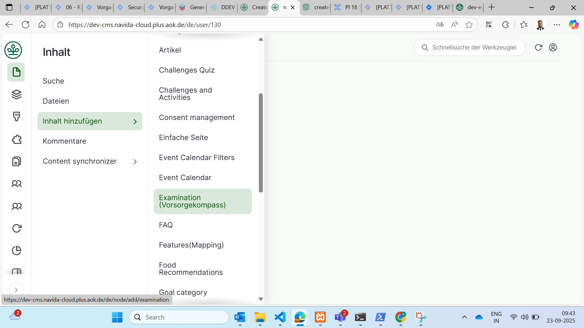 - Click on Inhalt(Content) -> Inhalt hinzufügen (Add Content) -> Examination (Vorsorgekompass)