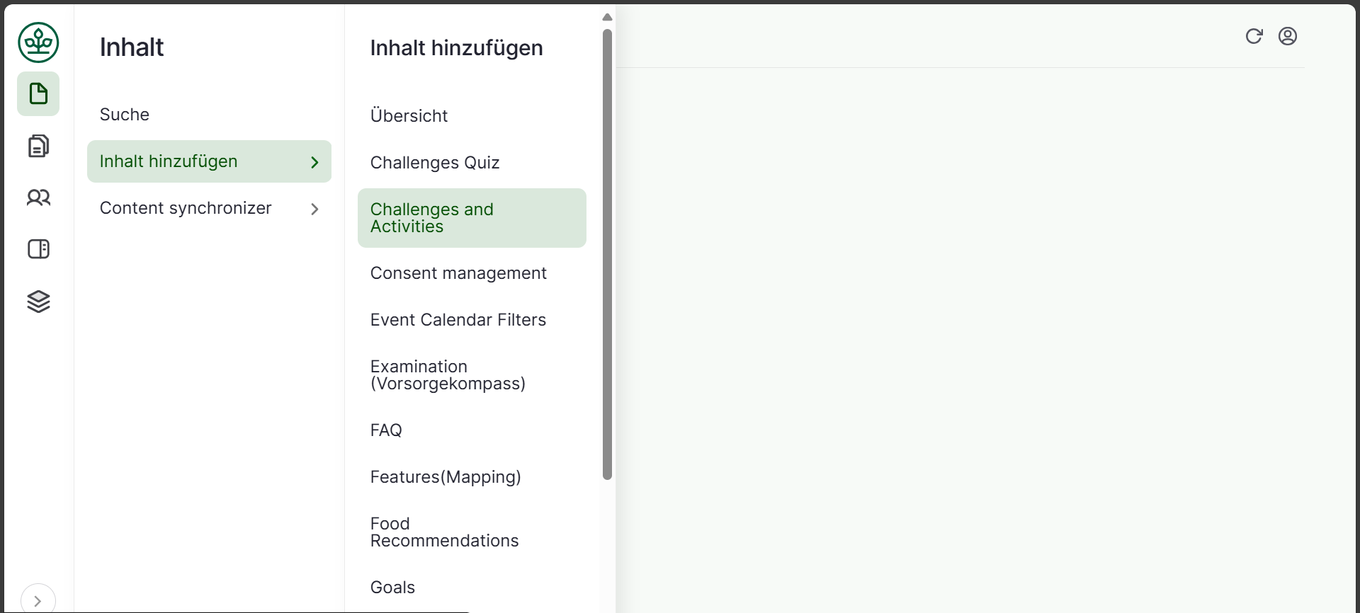 - Select Inhalt (Content) -> Inhalt hinzufügen (Add Content) -> Challenges and Activities
