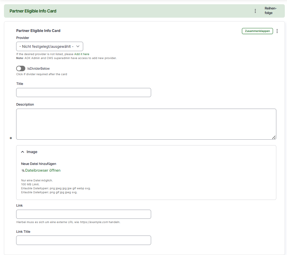 - Add 'Info Card Image' click on 'Dateibrowser öffnen (open file browser)' -> select image from the right section list of images -> click on 'Auswahlen (Select)' it will add image. (Please upload image in Files Server first and then select, do not upload image directly. Plese refer ImceFilesServer documentation for more information about how to upload images to CMS)